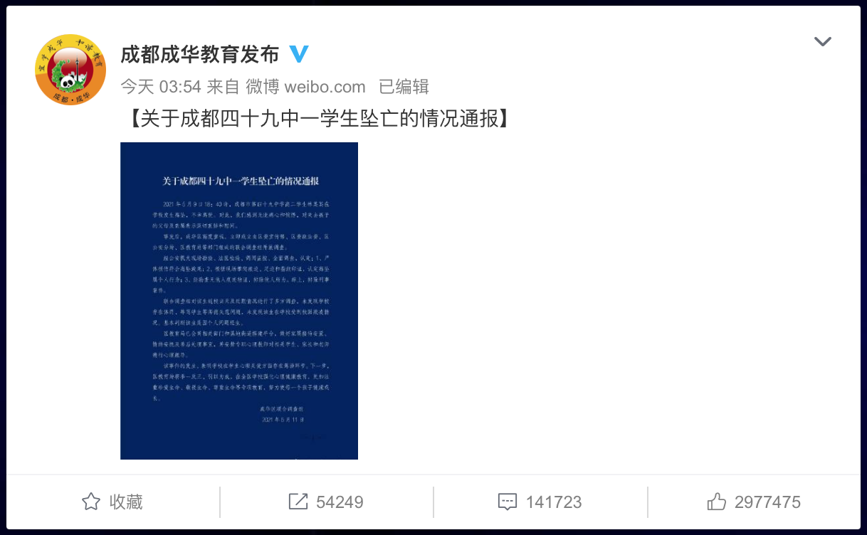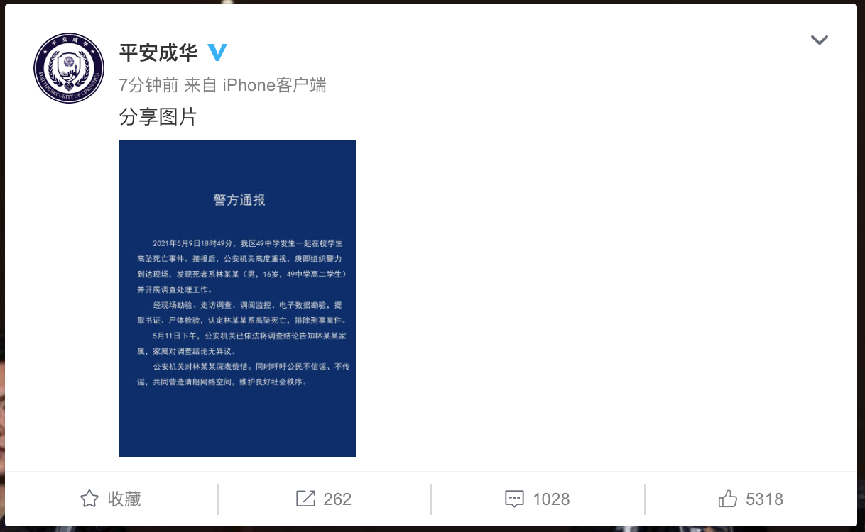 成都会公安局成华区分局传递“49中高中生坠亡”事故查询造访环境:认定系高坠逝世亡
