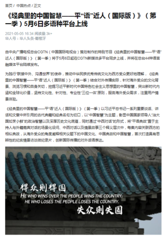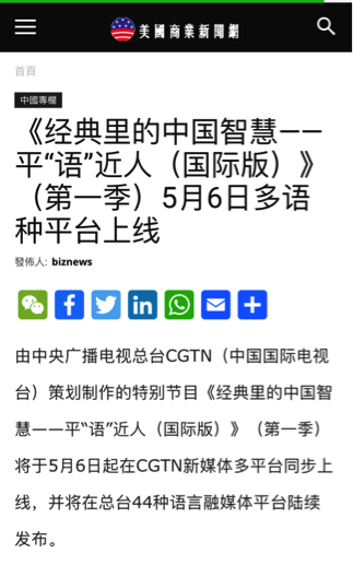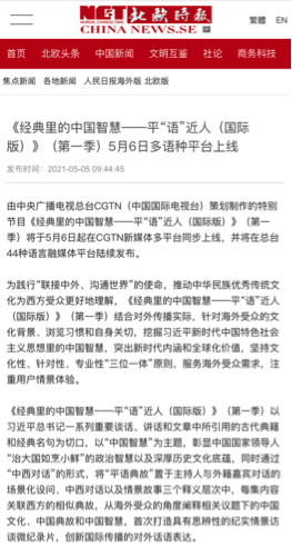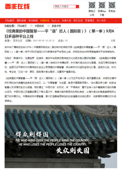 《经典里的中国聪明——平“语”近人(国际版)》(第一季)一上线即激发多家华文媒体高度关注美国商业新闻网、北欧时报网、日本华商网、欧侨网、葡新报、华人头条、西非在线、非洲时报等网站