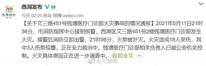 【杭州传递门诊部火灾致18人受伤:相关认真人已被节制】据@西湖宣布2021年5月11日21时36分