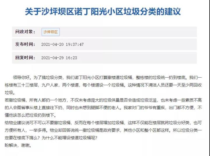 重庆收集问政平台上收到多条因撤销垃圾桶对市夷易近生活造成影响的帖文