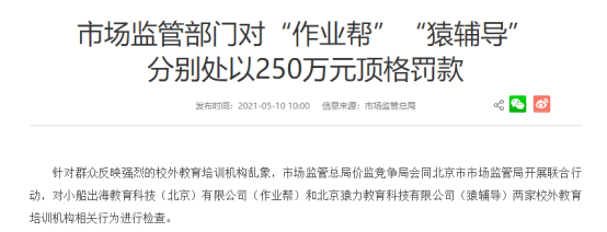 均处以警告和250万元顶格罚款的行政处罚。这是继今年4月以来北京市市场监管局针对群众反应强烈的校外教导培训机构组织专项反省以来的又一顶格罚款!(50万! 北京对“新东方在线”等4家校外机构顶格处罚)