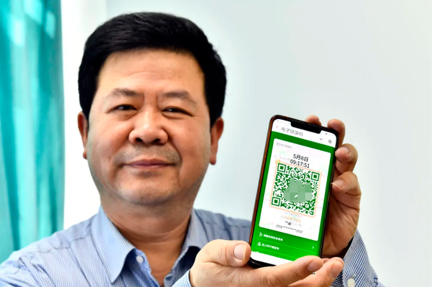 接种过新冠疫苗的援鄂医疗队队员、大年夜内科主任王言森展示自己的金色康健码(5月8日摄)