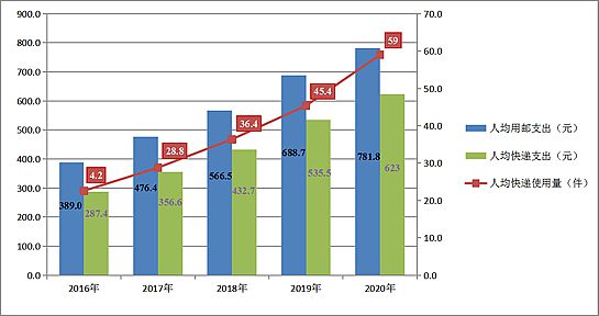 2016-2020年人均用邮支出、快递支出和快递应用量环境