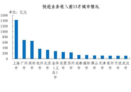快递营业收入排名前十五位的城市依次是上海、广州、深圳、杭州、北京、金华(义乌)、东莞、姑苏、成都、揭阳、佛山、天津、泉州、宁波、武汉。