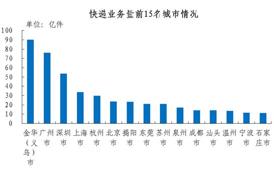 快递营业量排名前十五位的城市依次是金华(义乌)、广州、深圳、上海、杭州、北京、揭阳、东莞、姑苏、泉州、成都、汕头、温州、宁波和石家庄。