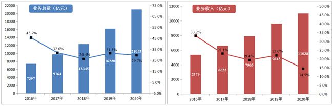 2020年邮政行业营业总量和营业收入分手冲破2万亿元和1万亿元。
