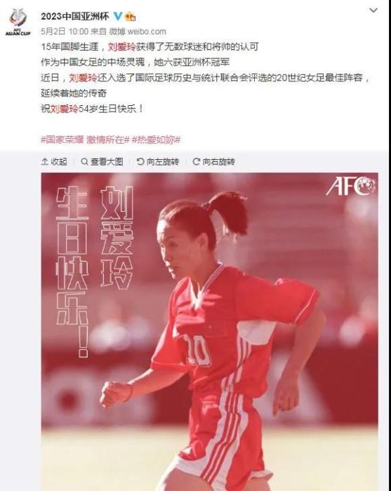 2023年亚足联中国亚洲杯官方微博发文祝刘爱玲生日快乐。