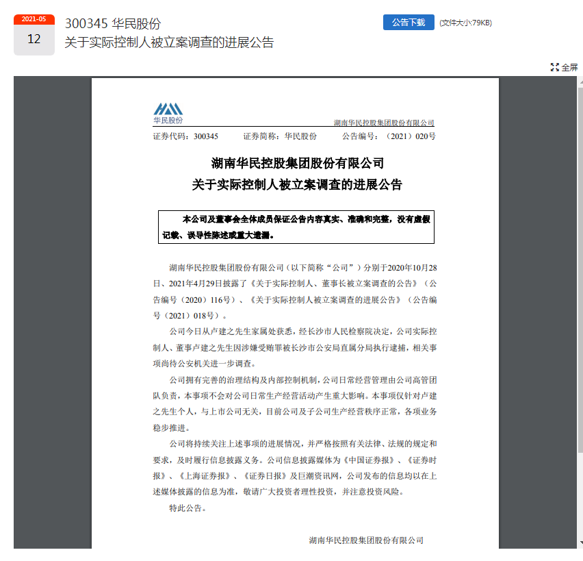 华夷易近股份分手于2020年10月28日、2021年4月29日表露了《关于实际节制人、董事长被存案查询造访的看护布告》(看护布告编号(2020)116号)、《关于实际节制人被存案查询造访的进展看护布告》(看护布告编号(2021)018号)。