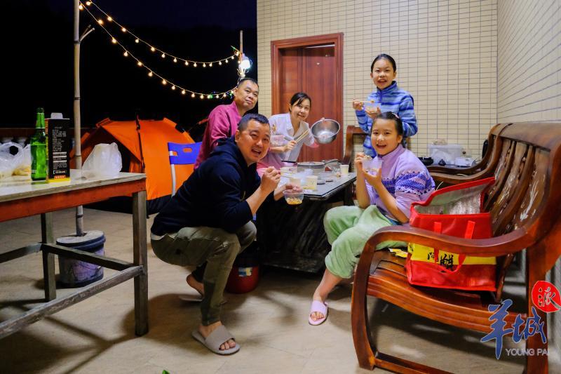2021年2月20日正月初九,广州从化区下溪村,游客在民宿楼顶打鸡煲,把自带的彩灯挂在晾衣杆上,搭起帐篷露营看星星。