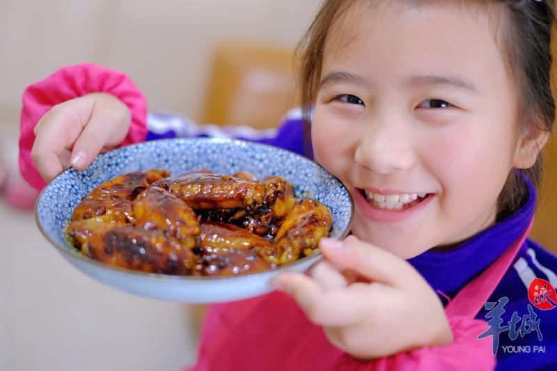 2021年2月16日正月初五,广州新年的小家庭乐悠悠,小女孩小艾在爸爸指导下做出美味的可乐鸡翅。