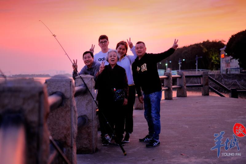 2021年2月14日大年初三,广州南沙十九涌,图片作者谢跃全家在晚霞中合影,临水垂钓乐融融。