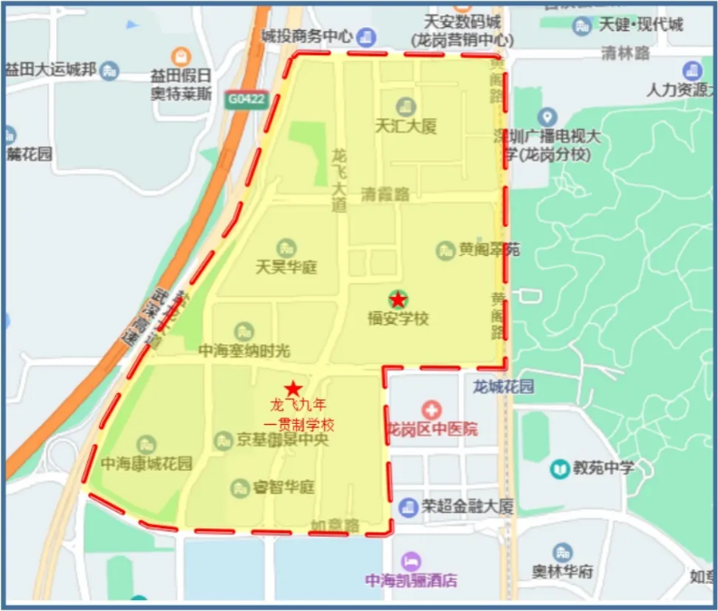 招生范围:清林路、如意路、黄阁路及盐龙大道围合范围内的住宅区域,及香港中文大学〔深圳〕区域。龙飞学校与相邻的福安学校均由香港中文大学〔深圳〕办学,实行总校长负责制,一体化办学,两校的招生范围完全共享。龙飞学校2021年的招生及开班情况视建设实际进展与福安学校统筹。