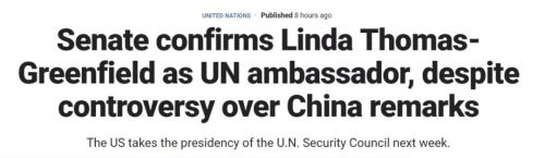 为了顺利就职,托马斯-格林菲尔德在近日提名听证会上努力表现出对华强硬立场。她对自己2019年的言论表示“遗憾”,自称中国对美国安全、价值观、生活方式等构成“威胁”。被迫改口自证,最终换来78票赞成、20票反对的结果,被正式批准担任驻联合国代表一职。