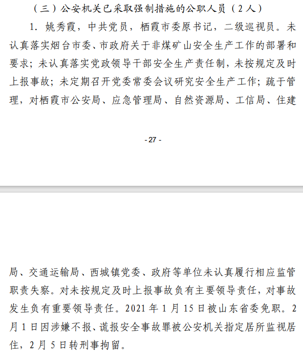 2月23日,山东省应急管理厅发布了该起事故调查报告,共50页、3万余字。原栖霞市委书记姚秀霞、原栖霞市市长朱涛的处理结果一并公布。