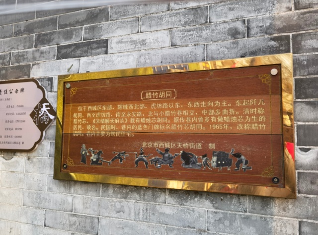 而杨先生不知道的是,曾经的宣武区腊竹芯胡同早已更名为西城区腊竹胡同,甲41号院也已不知所踪。胡同历史介绍牌显示,腊竹芯胡同形成于清朝,因胡同内曾多有做蜡烛芯为生的居民而得名。1965年,蜡竹芯胡同改名为腊竹胡同,如今胡同内主要为居民住宅。