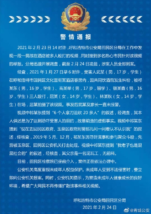 中新网2月24日电 据内蒙古自治区呼和浩特市公安局官方微博消息,2021年2月23日14时许,呼和浩特市公安局回民区分局在工作中发现一段一男孩在酒店被多人殴打的视频,同时接到多名热心市民针对该视频的举报。回民区分局迅速开展调查,截至2月24日凌晨,涉案人员全部到案。