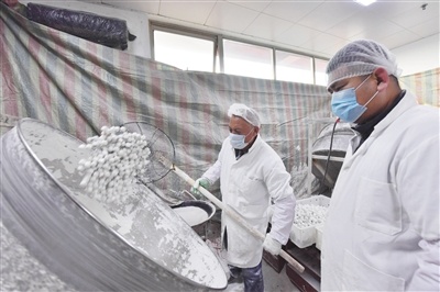 2月24日,锦芳小吃磁器口店,工作人员在门店后的车间摇元宵。新京报记者 李木易 摄