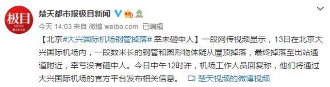 据楚天都市报极目新闻消息,一段网传视频显示,13日在北京大兴国际机场内,一段数米长的钢管和圆形物体疑从屋顶掉落,最终掉落至出站通道附近,幸亏没有砸中人。今日中午12时许,机场工作人员回复称,他们将通过大兴国际机场的官方平台发布相关信息。
