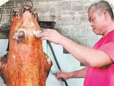 看着新鲜出炉的“金猪”,何国才很有成就感。在他看来,传统土法柴炉烧猪口感特别好,用电炉做的烧猪没有柴炉那种淡淡的烟熏味。但因为工艺复杂,产量较低,这些年本地保持传统柴炉做法的烧猪坊只有5家了。如今,烧猪于上南村不仅是家乡的味道,还成了当地村民脱贫奔小康和乡村振兴的“金猪”。何国才说,现在大家生活好过了,吃烧猪没有以前那么难,结婚、祭祖、开业、乔迁、聚会,都会买一头烧猪助兴。