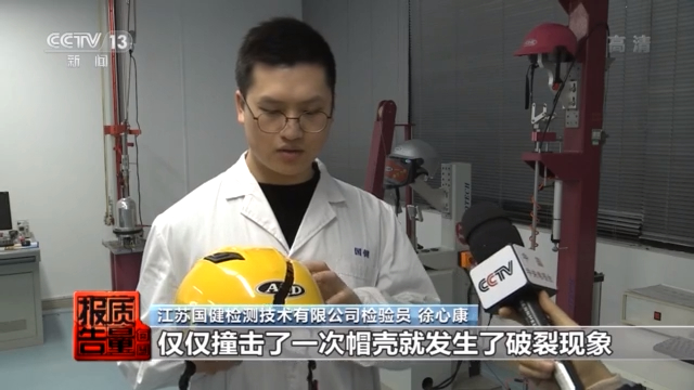 江苏国健检测技术有限公司工程师 张慧芬:吸收碰撞能量性能项目不合格原因主要是选材低劣。比如说ABS工程塑料或者PVC材料,或者是二次回收的材料。这类材料在吸收碰撞时,容易脆性开裂、碎片脱落,对佩戴者造成伤害,有的甚至是二次伤害。