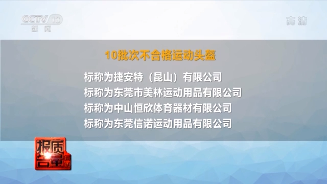 经过检测,10批次不合格的运动头盔,包括标称为捷安特(昆山)有限公司、标称为东莞市美林运动用品有限公司、标称为中山恒欣体育器材有限公司等生产的样品。