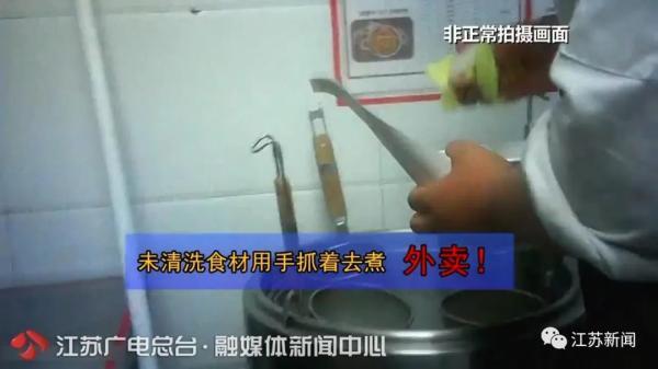 在加工外卖的时候,工作人员同样不清洗这些食材,一边拿着菜单, 一边就用手抓菜,放到汤锅里煮。
