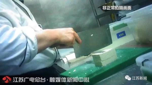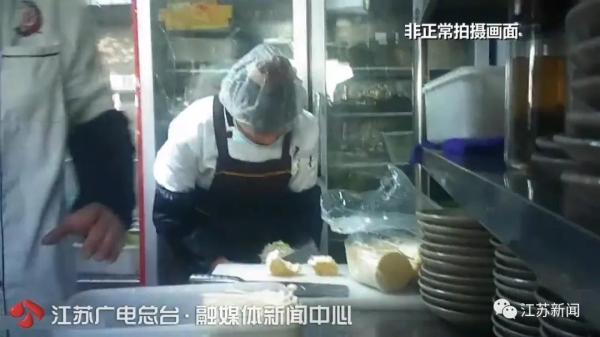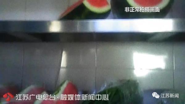 3月4日,一名工作人员没有戴手套,直接在切配间的菜板上切西瓜,旁边的案子上另一个工作人员正在杀鱼,切好的西瓜没有任何防护措施,就放在切配间的架子上。