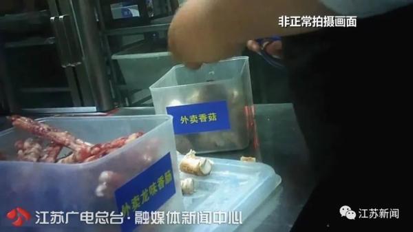 在店内的外卖区,用于外卖的香菇、香肠之类的食物,直接用剪刀剪开就放到了食盒里,没有清洗就被放到了外卖食材柜。
