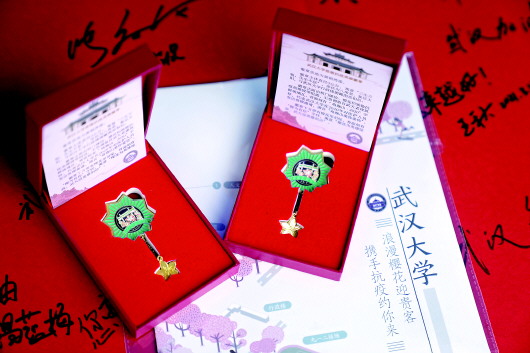 这是武汉大学为抗疫医护人员准备的纪念章和赏樱地图(3月13日摄)。记者熊琦摄