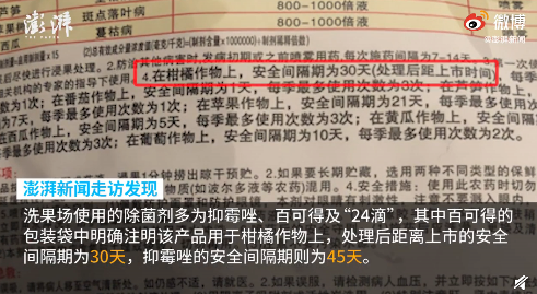 每年12月到次年4月底是沃柑的采摘季,为防止腐烂,果商会将部分沃柑经过抑菌农药浸泡或喷洒后再推向市场。近日业内人士爆料称,在沃柑的主要产区广西南宁武鸣区,部分果商为保证沃柑品相,擅自调高抑菌农药的稀释浓度,而泡药后的安全间隔期更是被各方长期忽视。3月12日,澎湃新闻记者以果商的身份向农业农村部农药处咨询,该处一名工作人员表示,除菌剂必须严格按照规定的用法及用量使用,未经储藏降解果面可能会有农药残留,对人体造成伤害。