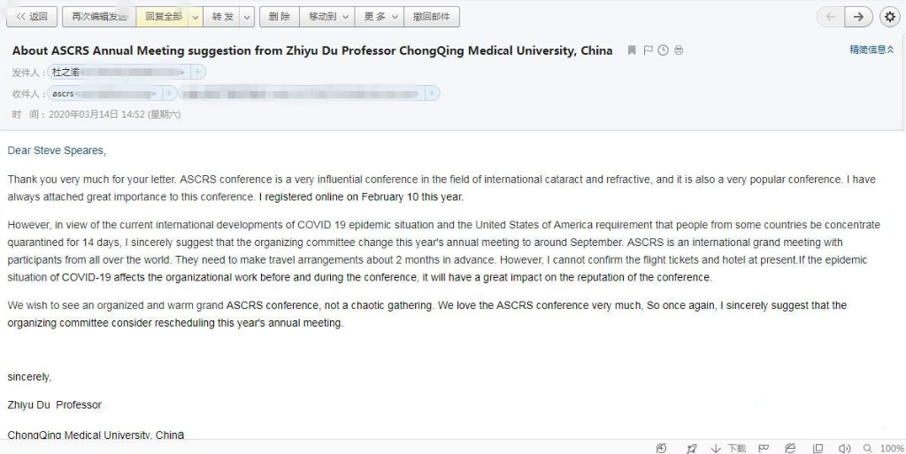 4天后,杜之渝收到了组委会主席Edward J. Holland回复——出于公共安全的考虑大会改期了!邮件写到“……组委会非常清楚您为这次会议所投入的大量时间和精力,并非常感谢您对教育的承诺。ASCRS正在探索重新安排会议的可能性,一旦我们有进一步的信息,我们将与您联系。祝您身体健康,并期待很快再次与您相见。” 杜之渝回信组委会主席Edward J. Holland “非常高兴地收到您的来信,非常理解和感谢组委会做出这样的决定,这既是从保障与会者的公共安全出发,也是从确保大会的声誉出发,这是一个非常明智的决定……。”国际会议能积极采纳“吹哨者”们的建议,体现了ASCRS这个组织严谨负责、勇于担当的精神。杜之渝教授敢于“吹哨”,以及连续数年受到ASCRS大会的邀请均展现出其在国际学术大舞台上的高度活跃的姿态。
