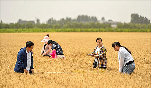 河北省邯郸市临漳县狄邱乡西狄邱村,农业技术人员在麦田内进行小麦测产。新华社记者 王晓 摄