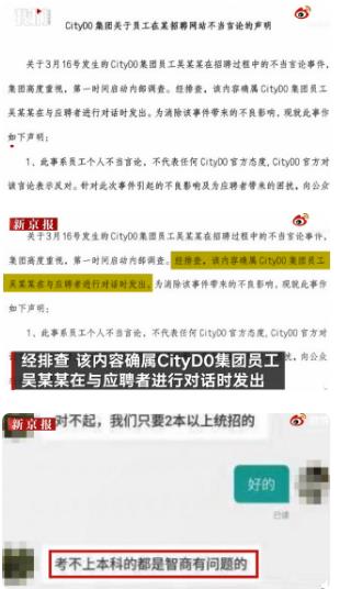 3月16日,CityD0集团回应员工在招聘网站上称“考不上本科是智商有问题”。经排查,该内容确属CityD0集团员工吴某某在与应聘者进行对话时发出,此事系员工个人不当言论,不代表任何CityD0官方态度,官方对该言论表示反对。