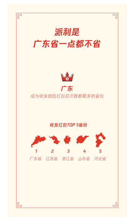 不能见面送祝福的牛年春节,大家在微信红包上玩出了更多新花样。春节期间,经济发达的广东省派发春节利是一点也不省,荣膺收发微信红包次数最多的省份,江苏省、浙江省、山东省和河北省紧随广东省,成为收发红包次数最多的5个省份。