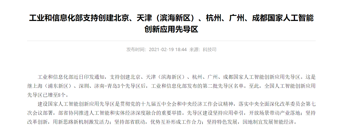 19日晚,工业和信息化部官网发布消息确认,支持创建北京、天津(滨海新区)、杭州、广州、成都国家人工智能创新应用先导区,这是继上海(浦东新区)、深圳、济南-青岛3个先导区后,工业和信息化部发布的第二批先导区名单。至此,全国人工智能创新应用先导区已增至8个。