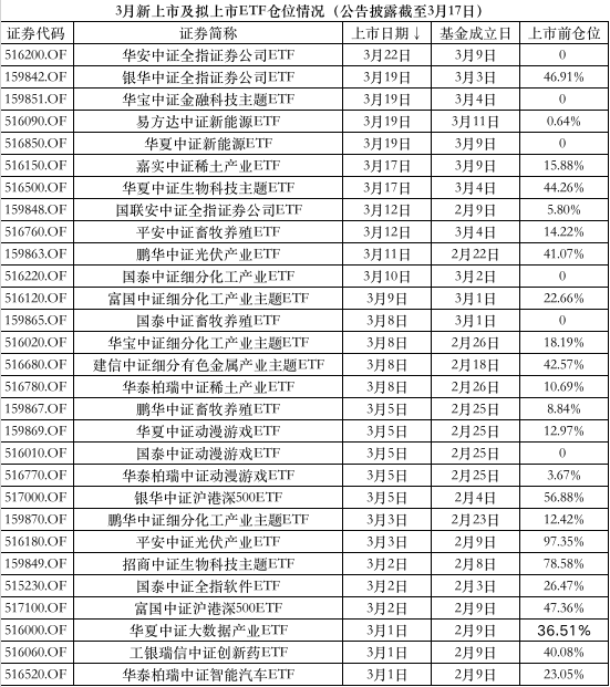 基金公司集中布局细分赛道交易型开放式指数基金(ETF),3月以来次新权益类ETF迎来上市高峰。然而,由于市场震荡加剧,基金经理建仓相当迟疑,新上市ETF整体仓位非常低,不少基金空仓上市。