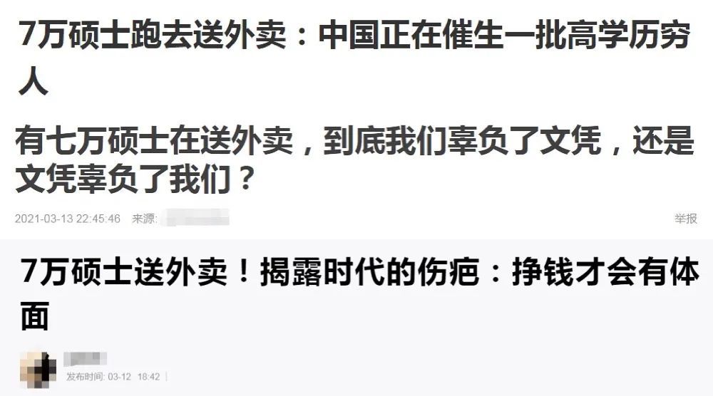 △自媒体据“全国七万硕士在送外卖”发挥出的标题