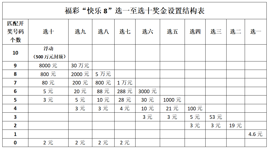 据悉,“快乐8”游戏是指从1至80共八十个号码中任意选择一至十个号码进行投注,每一组一个至十个号码的组合称为一注彩票;游戏共包括“选一”至“选十”,共十种玩法,各玩法均支持复式投注和胆拖投注,单注最高奖金500万元;而且游戏有十种玩法任选,返奖率高达58%。该游戏按不同玩法设奖,“选十”玩法中“选十中十”奖等采用浮动奖金设奖,其他玩法及奖等均采用固定奖金设奖。