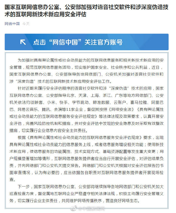 据“网信中国”18日公布,近日,国家互联网信息办公室、公安部指导各地网信部门、公安机关加强对语音社交软件和涉“深度伪造”技术的互联网新技术新应用安全评估工作。针对近期未履行安全评估程序的语音社交软件和涉“深度伪造”技术的应用,国家互联网信息办公室、公安部指导北京、天津、上海、浙江、广东等地方网信部门、公安机关依法约谈映客、小米、快手、字节跳动、鲸准数服、云账户、喜马拉雅、阿里巴巴、网易云音乐、腾讯、去演等11家企业,督促其按照相关法律法规及政策要求,认真开展安全评估,完善风险防控机制和措施,并对安全评估中发现的安全隐患及时采取有效整改措施,切实履行企业信息内容安全主体责任。