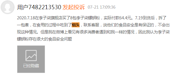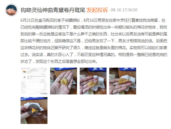 图为多位消费者投诉在李子柒螺蛳粉中吃出烟头