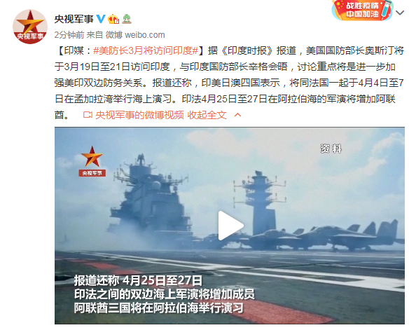 据《印度时报》报道,美国国防部长奥斯汀将于3月19日至21日访问印度,与印度国防部长辛格会晤,讨论重点将是进一步加强美印双边防务关系。报道还称,印美日澳四国表示,将同法国一起于4月4日至7日在孟加拉湾举行海上演习。印法4月25日至27日在阿拉伯海的军演将增加阿联酋。