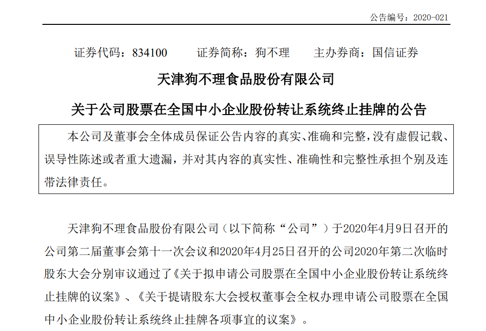 值得注意的是,狗不理集团全资控股子公司天津狗不理食品股份有限公司(下称“狗不理股份”)曾于2015年10月挂牌新三板,后于2020年5月终止挂牌。