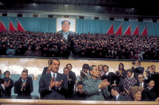 1972年2月23日,北京,美国总统理查德·尼克松访华期间,国务院总理周恩来与尼克松总统(左)观看乒乓球比赛。人民视觉供图