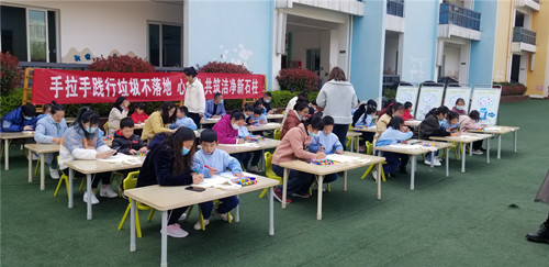 老师、孩子和家长展开“垃圾”接力投放活动。通讯员 郑鑫 摄
