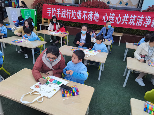 家长配合孩子在帆布袋上绘画垃圾桶色彩和标志。通讯员 郑鑫 摄