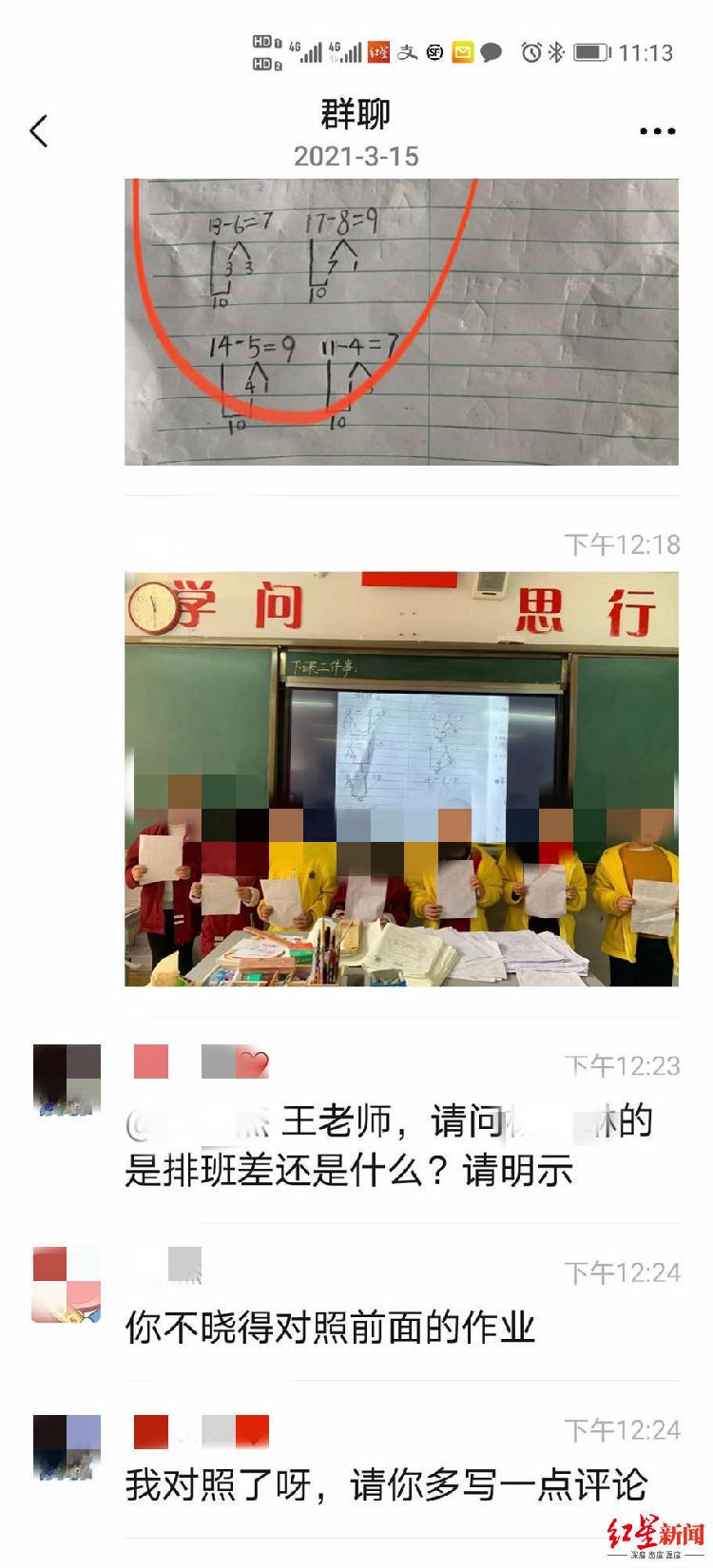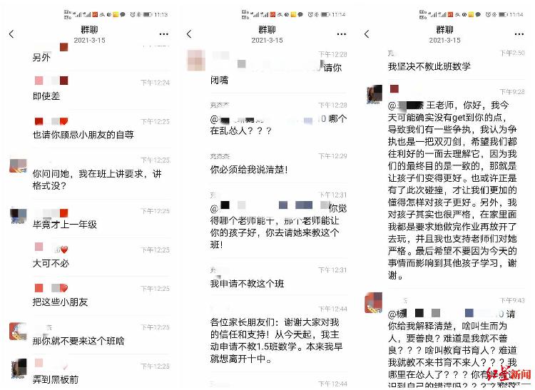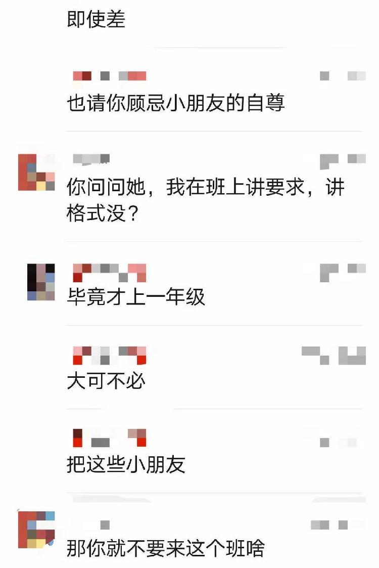 家长在群聊中表示,“即使差,也请你顾忌小朋友的自尊”“毕竟才上一年级”。而王老师则回复说,“那你就不要来这个班。”