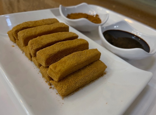 店里刚出炉的复古驴打滚上没有豆面,需要食客裹上一层红糖,再沾上炒好的豆面,喜欢甜食的人还可以根据自己的口味多蘸些红糖。“这有点像咱们老北京南宛北季的‘武吃自烤’,体验感强,料足味道好,得劲儿!”正在尝试这复古驴打滚吃法的韩先生说。