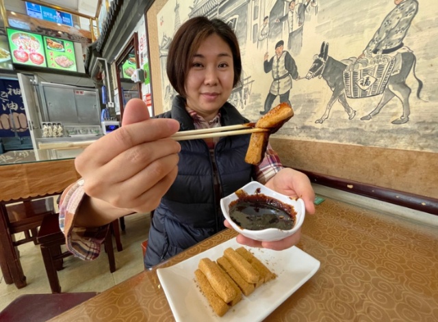“咱们平时看见卷着豆馅的驴打滚其实叫豆面糕,这跟传统的驴打滚还真不太一样。”护国寺小吃总店经理王新梅说,“最早的驴打滚不裹馅料,而是单独准备一盘炒得的豆面、一份秘制的红糖,甜味的清淡、豆面的丰俭全由个人。”
