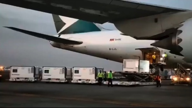 当地时间3月18日上午,载有中国援助墨西哥第四批次新冠疫苗的货运飞机降落在墨西哥城国际机场。