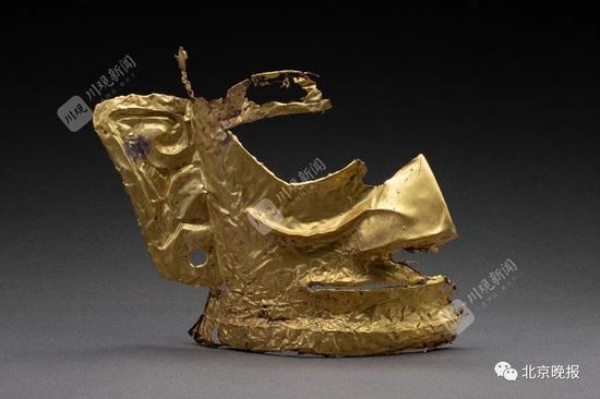 三星堆遗址考古发掘队副领队 四川大学考古文博学院教授 于孟洲:其实当时并不知道它是什么,只知道它是金箔片,因为它褶皱的非常厉害,而且它原本是翻过来放着的,然后除了它之外,旁边还有几片也是比较大的。